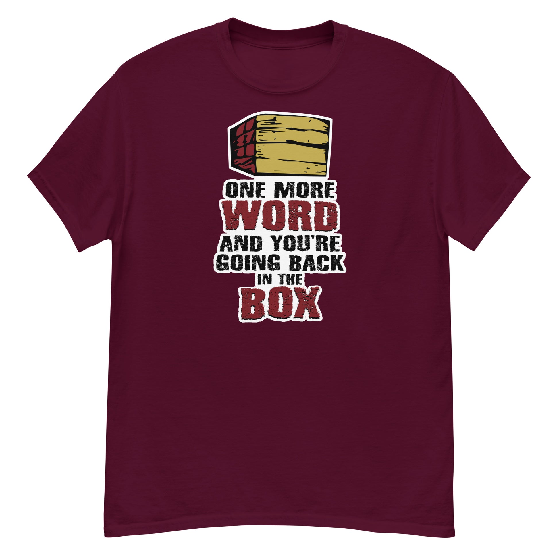 "One More Word and You're Going Back In The Box" T-shirt. Makes a funny gift for you or your True Crime friends.